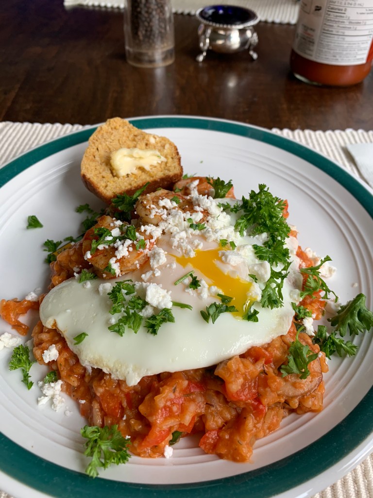- You can add the raw shrimp in when you add the sausage back in OR you can pan fry the shrimp separately. I like to do this because then I can make sure the shrimp don’t overcook and I can place them on top to make the dish look pretty. They should only take about 2 min per side. I dusted a bit of old bay seasoning on mine.