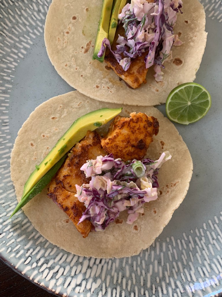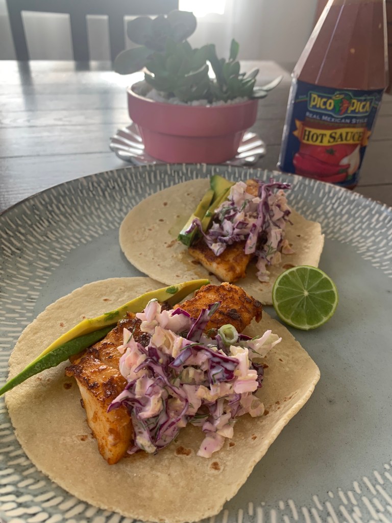 This dish is also very easily customizable. Use whatever mild, white fish of your choice. Fresh or frozen. Flour tortillas or corn. Hot sauce and toppings of your choice. You can make it as simple or as complicated as your please!